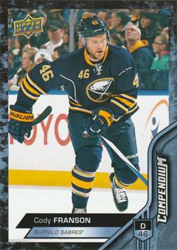 Cody Franson's Hockey cards are available in at least 39 sets. Cody Franson's biggest 7-day price movers are 2016 Upper Deck Compendium #33 Blue, 2016 Upper Deck Compendium #33 Gold, and 2016 Upper Deck Compendium #33 Printing Plates Cyan /1.