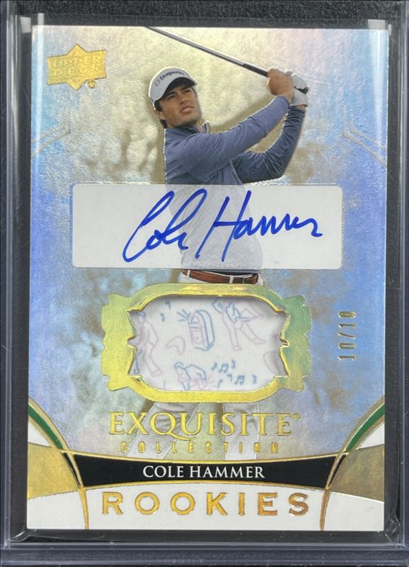 Cole Hammer's Golf cards are available in at least 2 sets. Cole Hammer's biggest 7-day price movers are 2024 Upper Deck Portfolio #EC-CH Exquisite Collection Auto Swatch Gold Spectrum Parallel Rookies /10, 2024 Upper Deck Portfolio #ARS-CH SP Authentic Authentic Rookies /999, and 2024 Upper Deck Portfolio #EC-CH Exquisite Collection Auto Parallel Rookies /99.