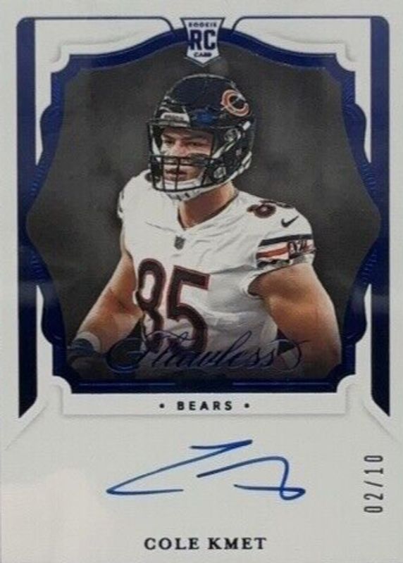 Cole Kmet's Football cards are available in at least 19 sets. Cole Kmet's biggest 7-day price movers are 2020 Flawless #RSS-CKM Rookie Shadow Signatures - Sapphire (/10), 2020 Select #374 Field Level Blue Die-Cut, and 2020 Select #274 Club Level Copper Die-Cut /355.