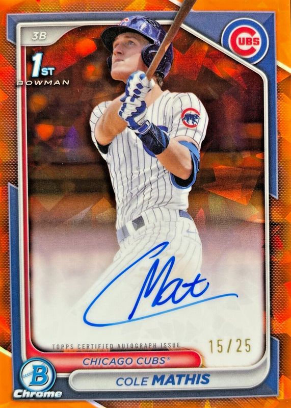 Cole Mathis' Baseball cards are available in at least 3 sets. Cole Mathis' biggest 7-day price movers are 2024 Bowman Draft Sapphire Edition #CPA-CMS Chrome Prospect Auto - Orange /25 (1st), 2025 Bowman Mega Box #BMA-CM Chrome Prospect Auto, and 2025 Bowman Mega Box #BMA-CM Chrome Prospect Auto - Black Refractor /10.