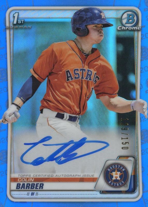 Colin Barber's Baseball cards are available in at least 2 sets. Colin Barber's biggest 7-day price movers are 2020 Bowman Chrome #CPA-CBA Prospect Auto - Blue Refractor /150 (1st), 2020 Bowman Chrome #CPA-CBA Prospect Auto - Green Shimmer Refractor /99 (1st), and 2020 Bowman Chrome #CPA-CBA Prospect Auto - Refractor /499 (1st).