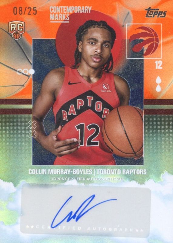 Collin Murray-Boyles' Basketball cards are available in at least 4 sets. Collin Murray-Boyles' biggest 7-day price movers are 2025 Topps Chrome #259 Refractor, 2025 Topps Chrome #259 Image Variation, and 2025 Topps #FF-CB Franchise Fabrics.