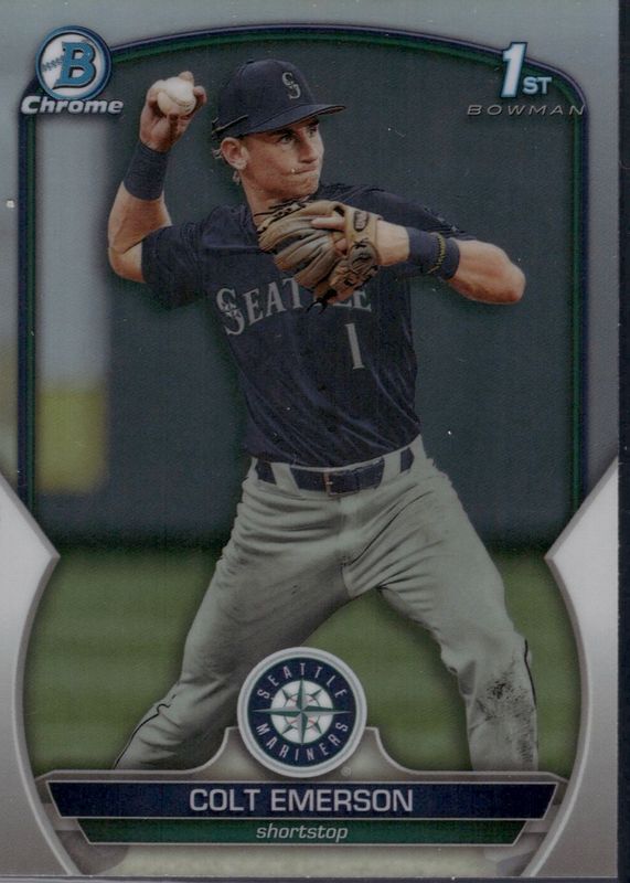 Colt Emerson's Baseball cards are available in at least 19 sets. Colt Emerson's biggest 7-day price movers are 2023 Bowman Draft #CDA-CE Chrome DP Auto - Green Refractor /99 (1st), 2023 Bowman Draft #BDC-42 Chrome - Refractor (1st), and 2023 Bowman Draft #BDC-42 Chrome - Purple Refractor /250 (1st).