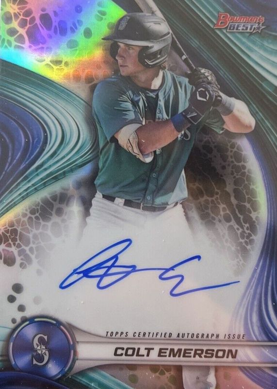 Colt Emerson's Baseball cards are available in at least 19 sets. Colt Emerson's biggest 7-day price movers are 2024 Bowman's Best #B24-CE Best of 2024 Autographs - Refractor, 2023 Bowman Draft #BDC-42 Chrome - Refractor (1st), and 2024 Bowman's Best #B24-CE Best of 2024 Autographs.