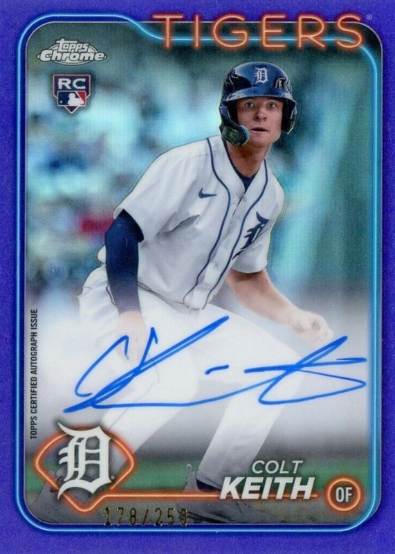 Colt Keith's Baseball cards are available in at least 51 sets. Colt Keith's biggest 7-day price movers are 2020 Bowman Draft #BD-54 Chrome - Refractor (1st), 2024 Topps Chrome #2 Base, and 2024 Topps Chrome #RA-CKE Rookie Autographs - Purple Refractor /250.