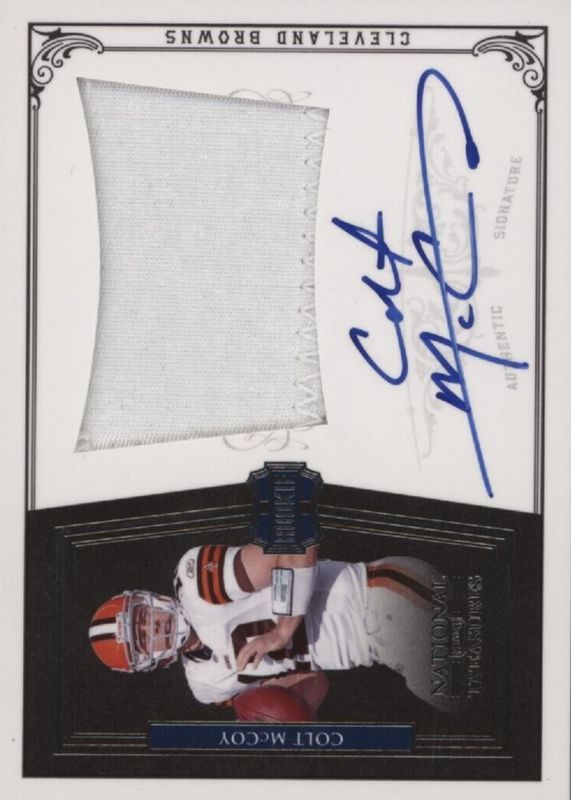 Colt McCoy's Football cards are available in at least 64 sets. Colt McCoy's biggest 7-day price movers are 2010 National Treasures #307 Rookie Patch Auto /99, 2018 Elite Draft Picks #22 Aspirations Red /49, and 2018 Elite Draft Picks #22 Status Teal Die-Cut /1.