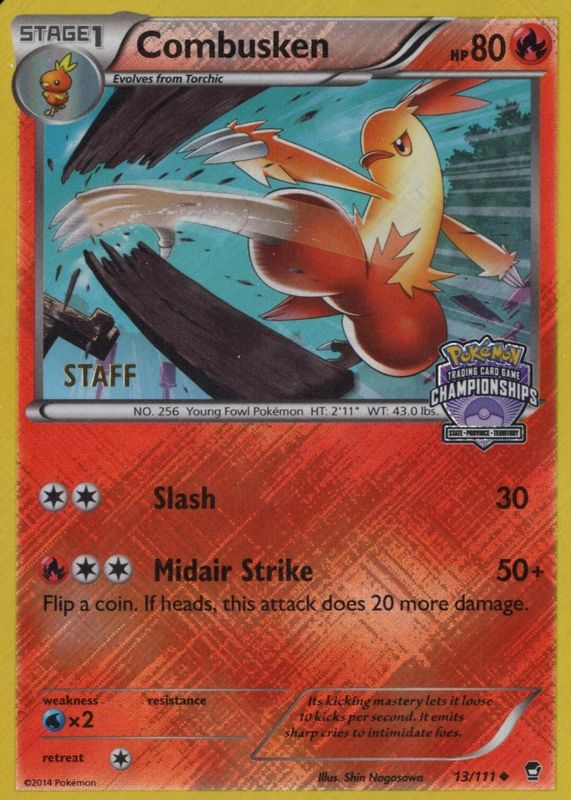 Combusken's Pokemon cards are available in at least 24 sets. Combusken's biggest 7-day price movers are 2006 EX: Crystal Guardians #031/100 Reverse Holo, 2014 XY: Furious Fists #013/111 Promo (State Championships - STAFF), and 2005 EX: Emerald #025/106 Reverse Holo.