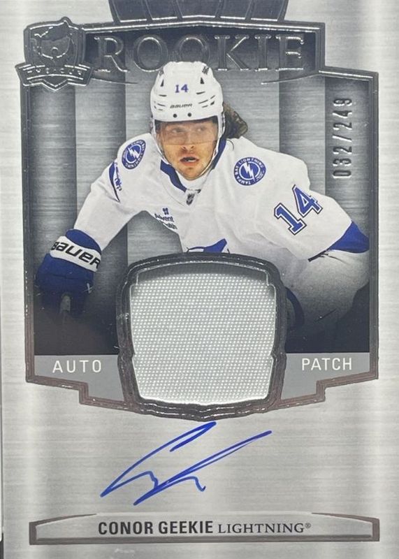 Conor Geekie's Hockey cards are available in at least 23 sets. Conor Geekie's biggest 7-day price movers are 2024 Upper Deck #478 Young Guns Base, 2024 Upper Deck The Cup #160 Rookie Patch Auto (/249), and 2024 SP #138 Rookie Authentics Signatures - Gold /25.