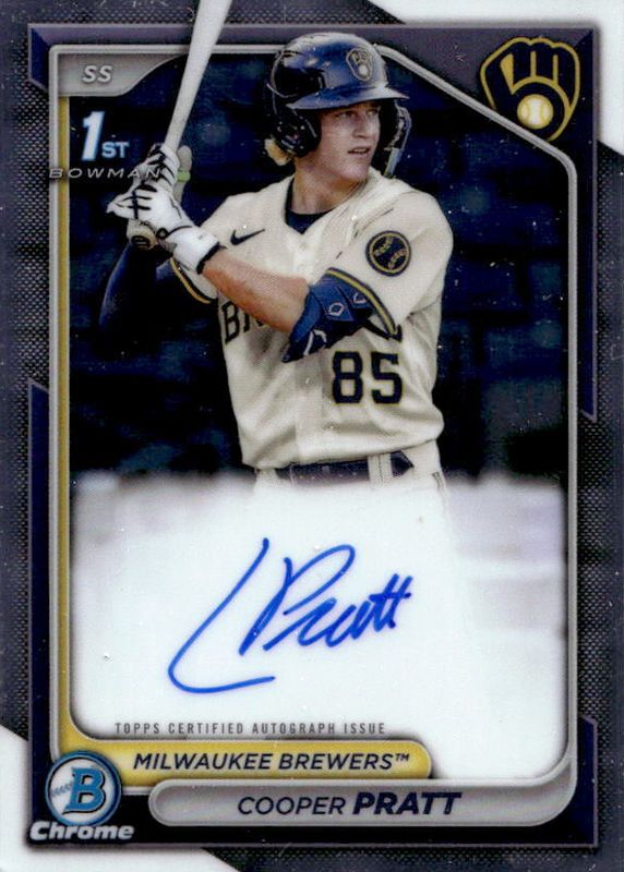 Cooper Pratt's Baseball cards are available in at least 15 sets. Cooper Pratt's biggest 7-day price movers are 2024 Bowman #BCP-137 Chrome Prospects (1st), 2024 Bowman #BCP-137 Chrome Prospects - Lunar Glow Refractor (1st), and 2024 Bowman #CPA-CPR Chrome Prospect Auto (1st).