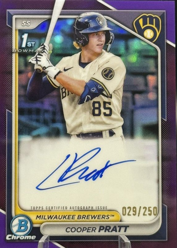 Cooper Pratt's Baseball cards are available in at least 11 sets. Cooper Pratt's biggest 7-day price movers are 2024 Bowman Mega Box #BCP-137 Chrome Prospects (1st), 2024 Bowman #CPA-CPR Chrome Prospect Auto - Purple Refractor /250 (1st), and 2024 Bowman #CPA-CPR Chrome Prospect Auto - Speckle Refractor /299 (1st).