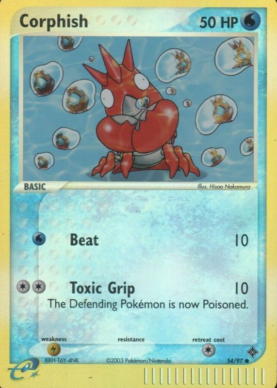 Corphish's Pokemon cards are available in at least 14 sets. Corphish's biggest 7-day price movers are 2003 EX: Dragon #54/97 Reverse Holo, 2006 EX: Holon Phantoms #063/110 Reverse Holo, and 2006 EX: Holon Phantoms #062/110 Reverse Holo.