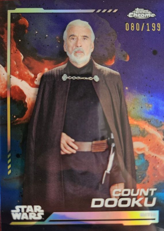 Count Dooku's Star Wars cards are available in at least 21 sets. Count Dooku's biggest 7-day price movers are 2024 Topps Chrome Star Wars #129 Kamino Aqua Refractor /199, 2024 Topps Chrome Star Wars #129 Dathomir Red Refractor /5, and 2024 Topps Chrome Star Wars #129 Blue Blaster Pulsar Refractor.