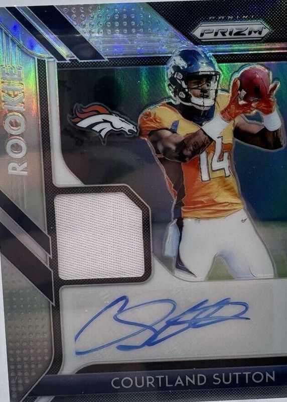 Courtland Sutton's Football cards are available in at least 48 sets. Courtland Sutton's biggest 7-day price movers are 2018 Donruss #312 Base, 2018 Prizm #RPA-CS Rookie Patch Auto /99, and 2018 Optic #RES-CS Rookie Elite Series Autographs (/15).
