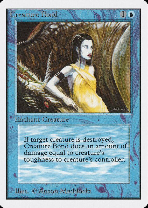 Creature Bond's Magic: The Gathering cards are available in at least 4 sets. Creature Bond's biggest 7-day price movers are 1993 Unlimited Edition Base, 1995 Fourth Edition Base, and 1993 Beta Edition Base.
