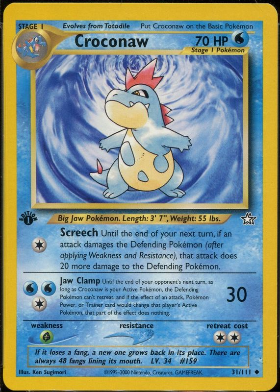 Croconaw's Pokemon cards are available in at least 16 sets. Croconaw's biggest 7-day price movers are 2005 EX: Unseen Forces #038/115 Reverse Holo, 2000 Neo Genesis #31/111 1st Edition, and 2011 Call of Legends #41/95 Reverse Holo.