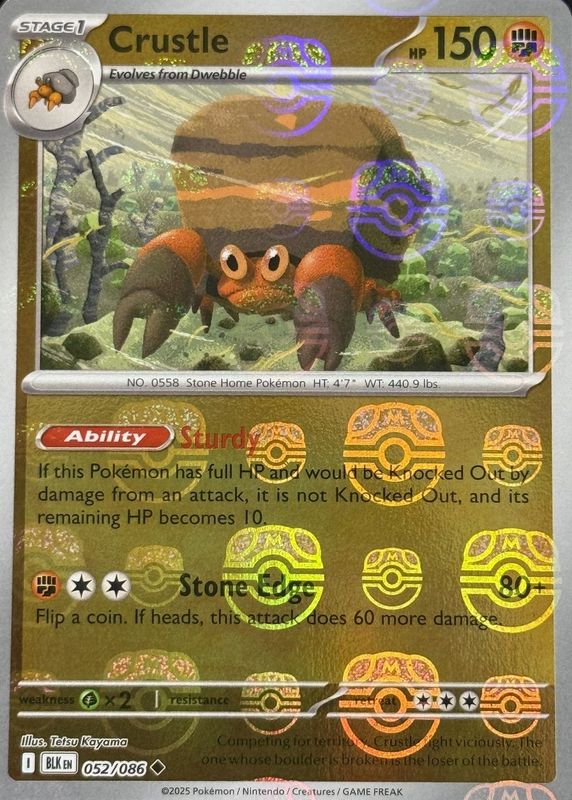 Crustle's Pokemon cards are available in at least 12 sets. Crustle's biggest 7-day price movers are 2012 Japanese Black & White: Cold Flare #038/059 1st Edition Holo, 2011 Japanese Black & White: Red Collection #002/066 1st Edition, and 2025 Japanese Scarlet & Violet: Heat Wave Arena #008/063 Holo.