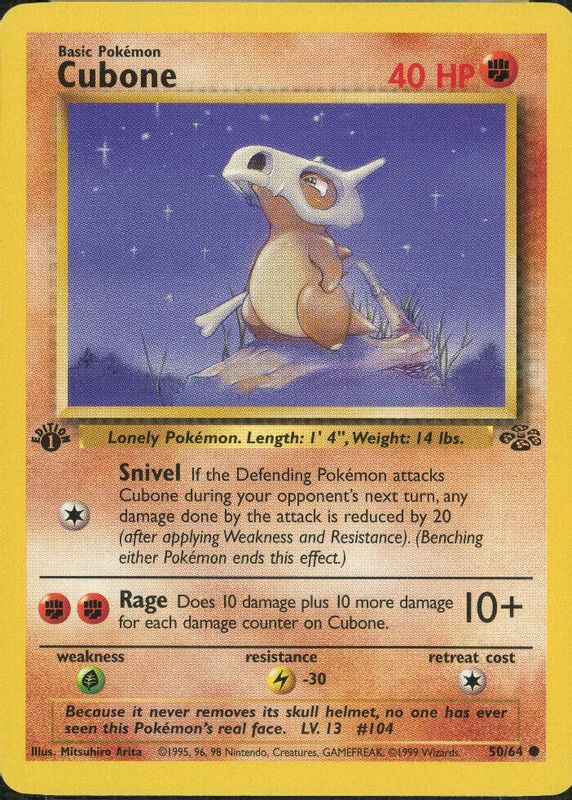Cubone's Pokemon cards are available in at least 31 sets. Cubone's biggest 7-day price movers are 1999 Jungle #50/64 1st Edition, 2004 EX: FireRed & LeafGreen #060/112 Base, and 2023 Japanese Scarlet & Violet: 151 #104/165 Master Ball Reverse Holo.