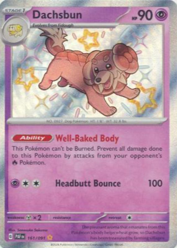 Dachsbun's Pokemon cards are available in at least 2 sets. Dachsbun's biggest 7-day price movers are 2023 Japanese Scarlet & Violet: Shiny Treasure ex #267/190 Shiny Rare, 2024 Scarlet & Violet: Paldean Fates #039/091 Base, and 2024 Scarlet & Violet: Paldean Fates #039/091 Reverse Holo.