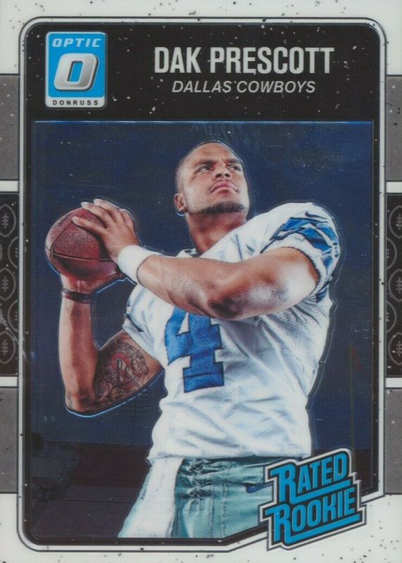 Dak Prescott's Football cards are available in at least 212 sets. Dak Prescott's biggest 7-day price movers are 2024 Prizm #73 Black & White Checker /(SSP), 2016 Optic #162 Red & Yellow, and 2016 Optic #162 Purple.