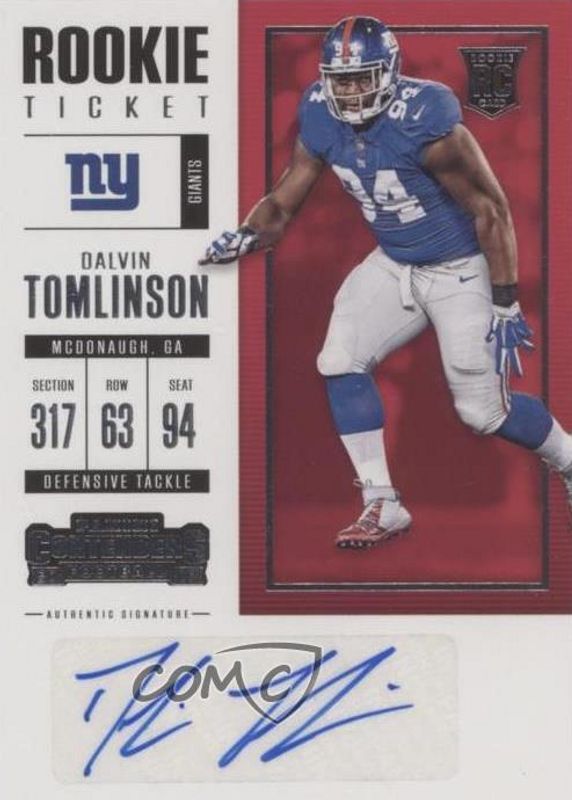 Dalvin Tomlinson's Football cards are available in at least 1 sets. Dalvin Tomlinson's biggest 7-day price movers are 2017 Contenders #156 Rookie Ticket Auto, and 2017 Contenders #278 Rookie Ticket Auto Variation.