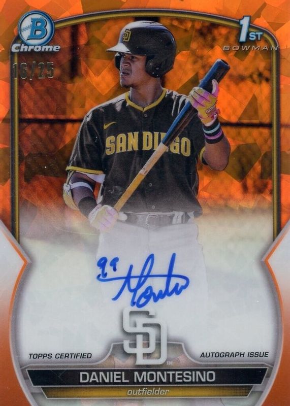 Daniel Montesino's Baseball cards are available in at least 6 sets. Daniel Montesino's biggest 7-day price movers are 2023 Bowman Sapphire Edition #BSPA-DM Chrome Prospect Auto - Orange /25 (1st), 2023 Bowman #BCP-114 Chrome Prospects - Fuchsia Refractor /199 (1st), and 2023 Bowman #BCP-114 Chrome Prospects - Blue RayWave Refractor /150 (1st).