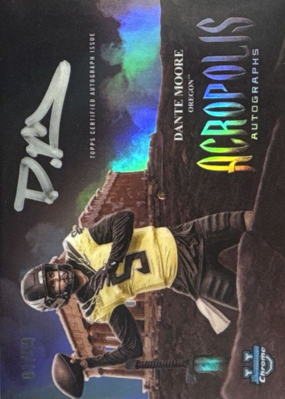 Dante Moore's Football cards are available in at least 7 sets. Dante Moore's biggest 7-day price movers are 2025 Prizm Draft Picks #164 Purple Ice /199, 2025 Prizm Draft Picks #164 Blue /249, and 2025 Prizm Draft Picks #164 Red /399.