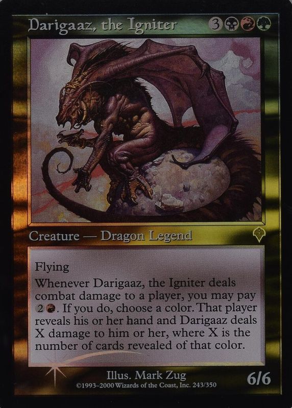 Darigaaz, the Igniter's Magic: The Gathering cards are available in at least 1 sets. Darigaaz, the Igniter's biggest 7-day price movers are 2000 Invasion #243 Foil, and 2000 Invasion #243 Base.