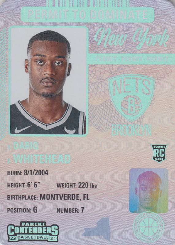 Dariq Whitehead's Basketball cards are available in at least 35 sets. Dariq Whitehead's biggest 7-day price movers are 2023 Contenders #22 Permit to Dominate /(SSP), 2023 Prizm #175 Multi Wave /88, and 2023 Prizm #175 Green Ice.