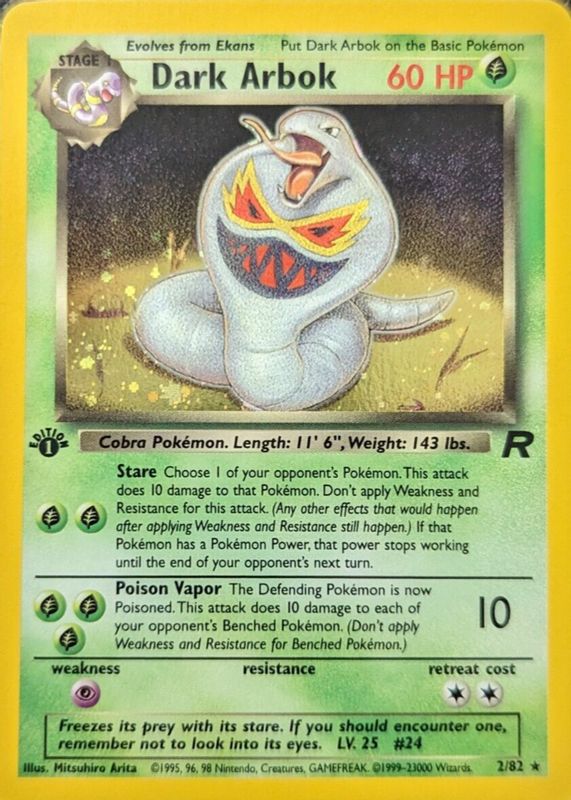 Dark Arbok's Pokemon cards are available in at least 4 sets. Dark Arbok's biggest 7-day price movers are 2000 Team Rocket #02/82 1st Edition Holo, 2000 Team Rocket #19/82 1st Edition, and 2000 Team Rocket #19/82 Unlimited.