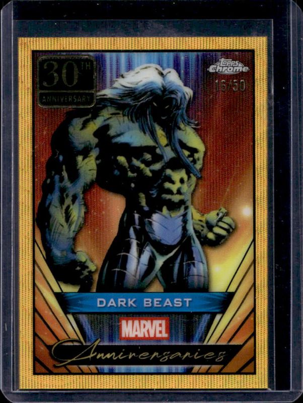 The biggest 30-day change Dark Beast cards are 2025 Topps Chrome #MA-19 Marvel Anniversaries - Gold Wave Refractor /50, 2025 Topps Chrome #MA-19 Marvel Anniversaries - Black Refractor /10, and 2025 Topps Chrome #MA-19 Marvel Anniversaries - Orange Refractor /25.