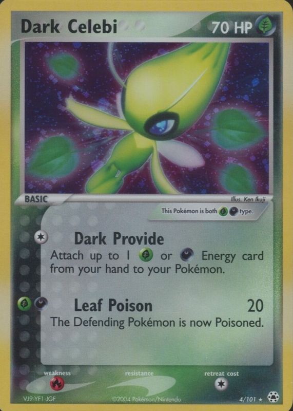 Dark Celebi's Pokemon cards are available in at least 1 sets. Dark Celebi's biggest 7-day price movers are 2004 EX: Hidden Legends #004/101 Holo, and 2004 EX: Hidden Legends #004/101 Reverse Holo.