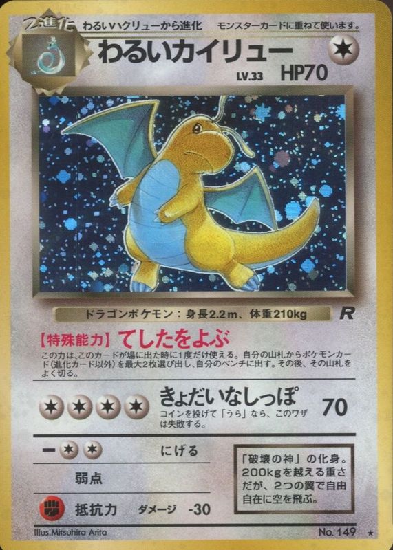 Dark Dragonite's Pokemon cards are available in at least 4 sets. Dark Dragonite's biggest 7-day price movers are 1997 Japanese Rocket Gang #149 Holo, 2000 Team Rocket #05/82 Unlimited Holo, and 2000 Team Rocket #05/82 1st Edition Holo.