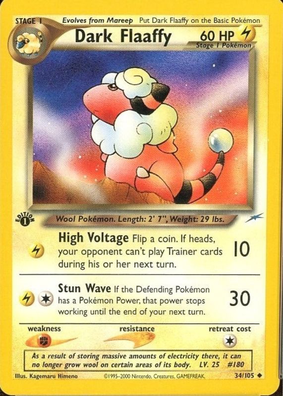 Dark Flaaffy's Pokemon cards are available in at least 3 sets. Dark Flaaffy's biggest 7-day price movers are 2004 Japanese EX: Rocket Gang Strikes Back #038/084 1st Edition, 2004 EX: Team Rocket Returns #033/109 Base, and 2002 Neo Destiny #34/105 1st Edition.