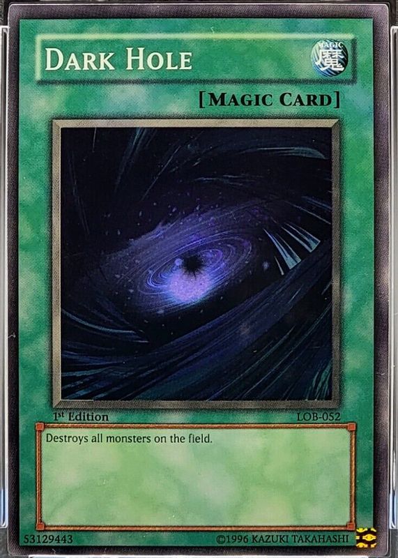 Dark Hole's Yu-Gi-Oh! cards are available in at least 1 sets. Dark Hole's biggest 7-day price movers are 2002 Legend of Blue Eyes White Dragon #LOB-052 1st Edition (Super Rare), and 2002 Legend of Blue Eyes White Dragon #LOB-052 Base (Super Rare).