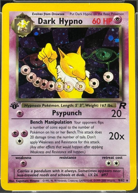 Dark Hypno's Pokemon cards are available in at least 4 sets. Dark Hypno's biggest 7-day price movers are 2000 Team Rocket #09/82 1st Edition Holo, 2000 Team Rocket #26/82 1st Edition, and 2000 Team Rocket #09/82 Unlimited Holo.