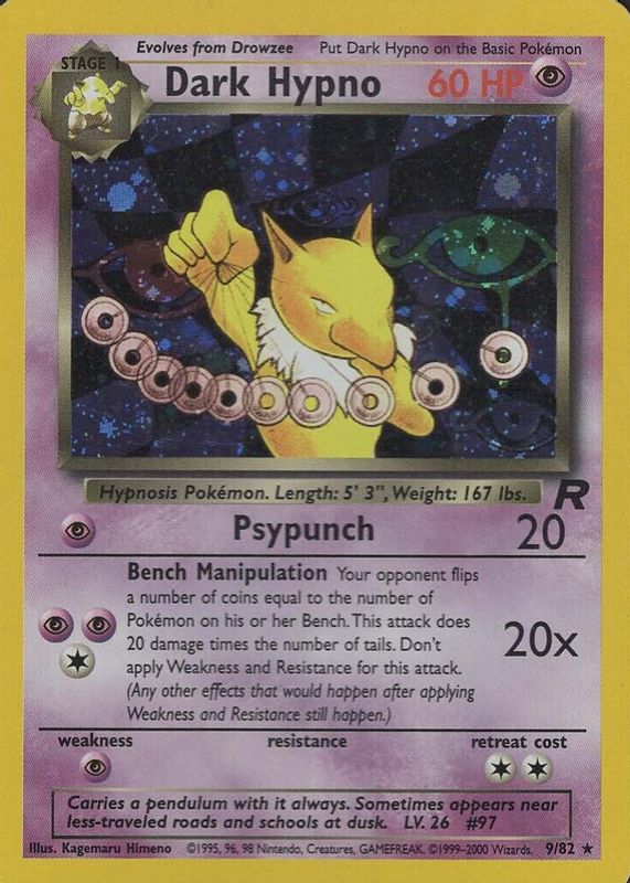Dark Hypno's Pokemon cards are available in at least 4 sets. Dark Hypno's biggest 7-day price movers are 2000 Team Rocket #09/82 Unlimited Holo, 1997 Japanese Rocket Gang #97 Holo, and 2004 EX: Team Rocket Returns #006/109 Reverse Holo.