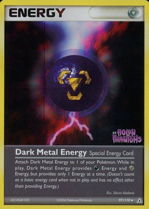 Dark Metal Energy's Pokemon cards are available in at least 3 sets. Dark Metal Energy's biggest 7-day price movers are 2006 EX: Holon Phantoms #097/110 Reverse Holo, 2006 EX: Holon Phantoms #097/110 Base, and 2004 Japanese EX: Rocket Gang Strikes Back #084/084 1st Edition.