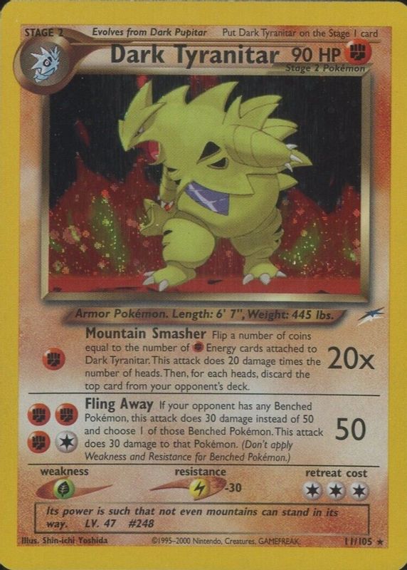 Dark Tyranitar's Pokemon cards are available in at least 3 sets. Dark Tyranitar's biggest 7-day price movers are 2002 Neo Destiny #11/105 Holo, 2004 EX: Team Rocket Returns #019/109 Reverse Holo, and 2004 EX: Team Rocket Returns #019/109 Base.
