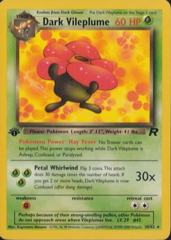 Dark Vileplume's Pokemon cards are available in at least 2 sets. Dark Vileplume's biggest 7-day price movers are 2000 Team Rocket #30/82 1st Edition, 1997 Japanese Rocket Gang #45 Holo, and 2000 Team Rocket #13/82 1st Edition Holo.