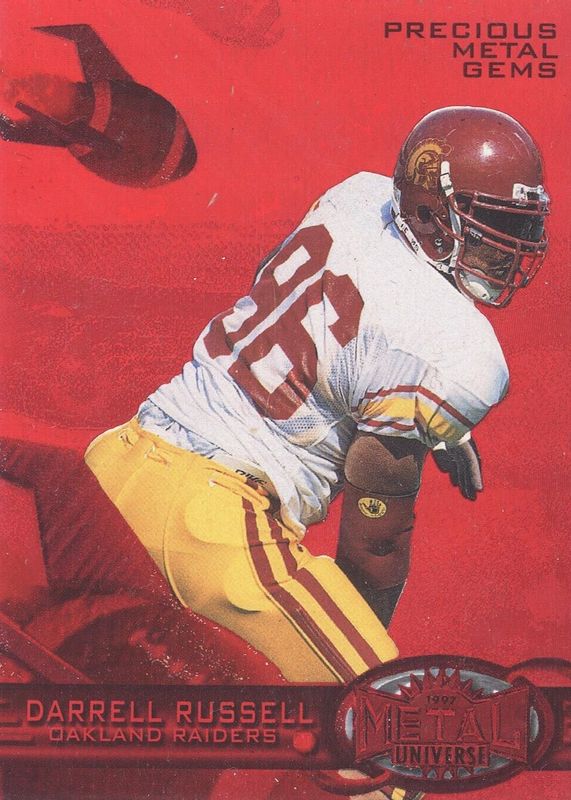 Darrell Russell's Football cards are available in at least 15 sets. Darrell Russell's biggest 7-day price movers are 1997 Metal Universe #176 Precious Metal Gems Red /135, 1997 Metal Universe #176 Precious Metal Gems Green /15, and 1998 SPx #34 Base.