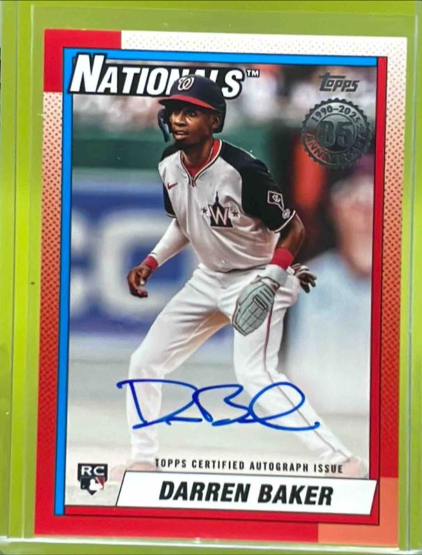 Darren Baker's Baseball cards are available in at least 23 sets. Darren Baker's biggest 7-day price movers are 2025 Topps Update #90B2-DBA 1990 Topps Autographs, 2025 Topps Update #90B2-DBA 1990 Topps Autographs - Gold Foil /50, and 2025 Topps Update #90B2-DBA 1990 Topps Autographs - Black Foil /10.