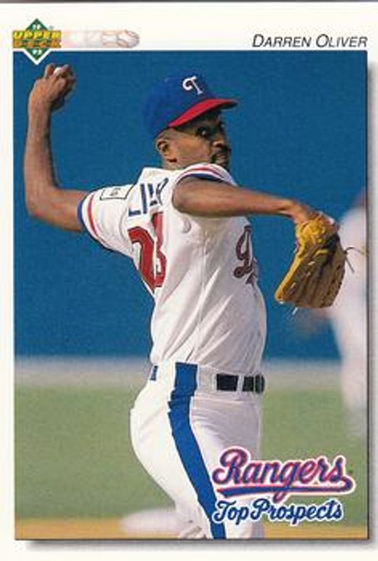 Darren Oliver's Baseball cards are available in at least 15 sets. Darren Oliver's biggest 7-day price movers are 1992 Upper Deck Minor League #308 Base, 1995 Upper Deck Collector's Choice #399 Base, and 1995 Upper Deck Collector's Choice #399 Silver Signatures.