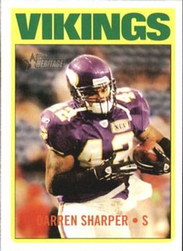 Darren Sharper's Football cards are available in at least 5 sets. Darren Sharper's biggest 7-day price movers are 2005 Topps Heritage #326 Base, 2001 Fleer Tradition Glossy #37 Base /2001, and 2003 Topps Total #46 Base.