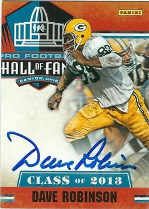 Dave Robinson's Football cards are available in at least 11 sets. Dave Robinson's biggest 7-day price movers are 2013 National Treasures #7 Pro Football Hall of Fame 2013, 2018 Unparalleled #PP-DR Pioneer Penmanship - Burst /1, and 2018 Unparalleled #PP-DR Pioneer Penmanship - Fireworks /5.