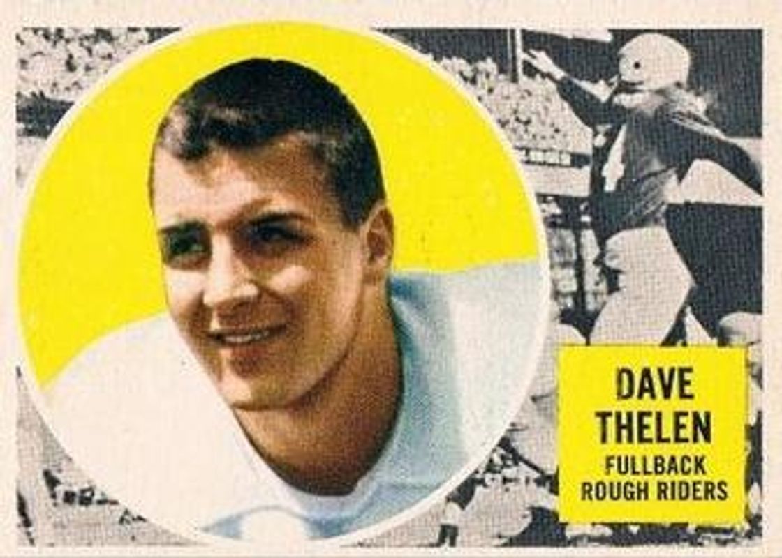 Dave Thelen's Football cards are available in at least 5 sets. Dave Thelen's biggest 7-day price movers are 1960 Topps CFL #67 Base, 1961 Topps CFL #84 Base, and 1962 Topps CFL #111 Base.