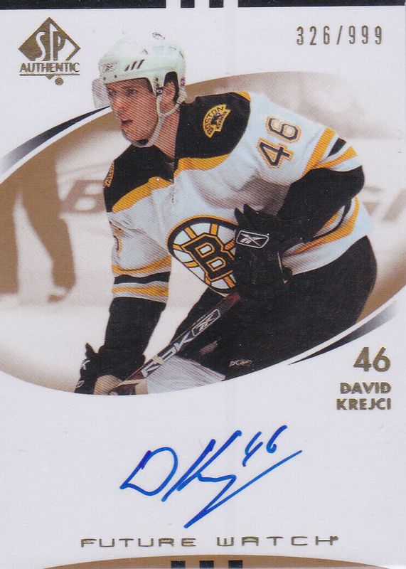 David Krejci's Hockey cards are available in at least 122 sets. David Krejci's biggest 7-day price movers are 2007 SP Authentic Future Watch Auto /999, 2005 In The Game Heroes & Prospects #A-DKR Autographs, and 2005 In The Game Heroes & Prospects #140 Toronto Spring Expo Silver /10.