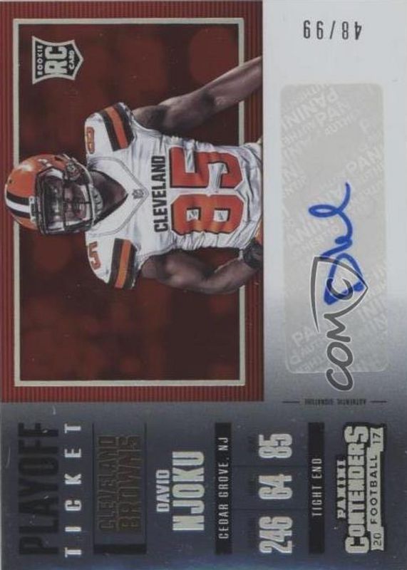 David Njoku's Football cards are available in at least 14 sets. David Njoku's biggest 7-day price movers are 2017 Contenders #257 Rookie Ticket Auto Variation - Playoff Ticket (/99), 2017 Select #120 Premier Level Black Die-Cut /1, and 2017 Donruss #314 Press Proof Gold Die-Cut /25.