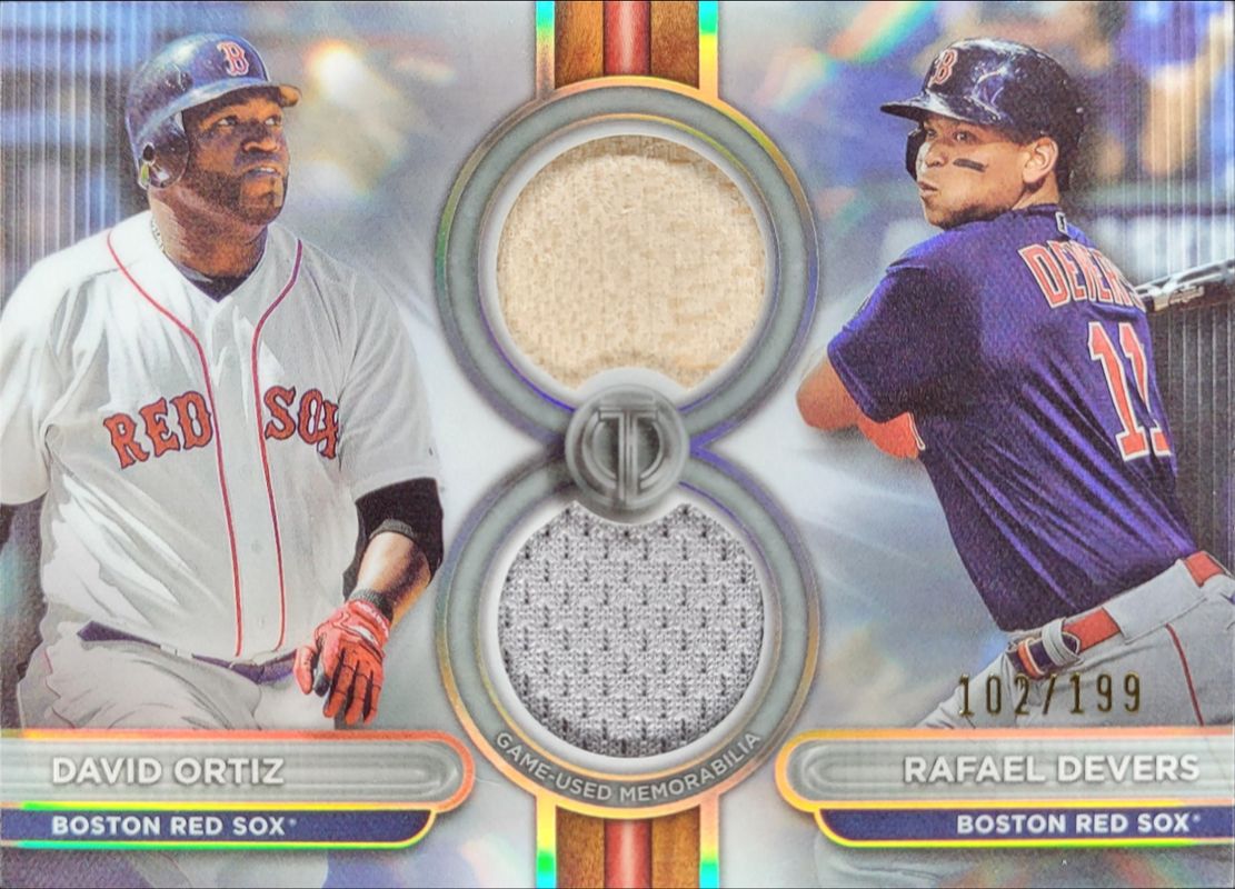 David Ortiz / Rafael Devers' Baseball cards are available in at least 9 sets. David Ortiz / Rafael Devers' biggest 7-day price movers are 2024 Topps Tribute #DR2-OD Dual Relics Dual Player /199, 2024 Topps Tribute #DR2-OD Dual Relics Dual Player - Orange /25, and 2024 Topps Tribute #DR2-OD Dual Relics Dual Player - Black /1.