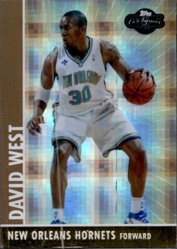 David West's Basketball cards are available in at least 130 sets. David West's biggest 7-day price movers are 2008 Topps Co-Signers #60 Hyper Gold /10, 2008 Topps Co-Signers #60 Press Plates Cyan /1, and 2008 Topps Co-Signers #60 Bronze /299.