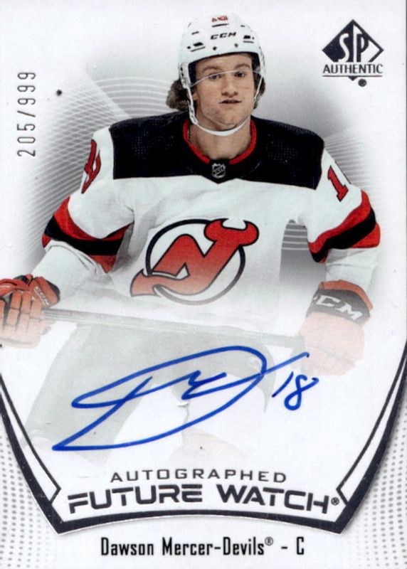 Dawson Mercer's Hockey cards are available in at least 61 sets. Dawson Mercer's biggest 7-day price movers are 2021 SP Authentic #176 Future Watch Auto /999, 2024 O-Pee-Chee Platinum #R-52 2023-24 Update Retro Autographs - Red Rainbow, and 2024 O-Pee-Chee Platinum #85 Neon Yellow Surge.